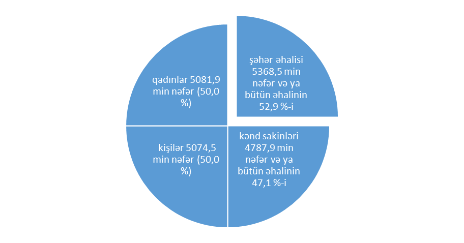Азербайджан занимает 90-е место в мире по численности населения, при этом 56% населения составляют городские жители. На начало 2022 года население страны составляет 10 156,4 тыс. человек, из которых 5 368,5 тыс. человек проживают в городах, а 4 787,9 тыс. человек – в сельской местности. По гендерному признаку, численность мужчин и женщин практически равномерна.