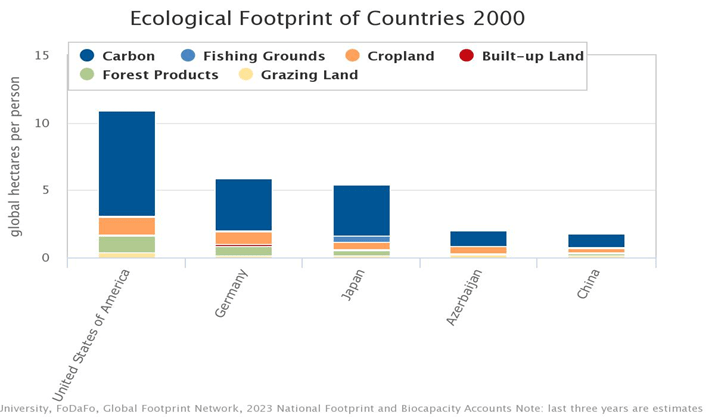 Можем продолжить данную тематику в виде анализа среди различных стран. Для сравнительного анализа экологического следа США, Германии, Японии, Китая и Азербайджана в динамике с 2000 по 2022 годы рассматриваются показатели выбросов CO2, рыболовных угодий, пахотных земель, застроенных земель, лесных угодий и пастбищ.